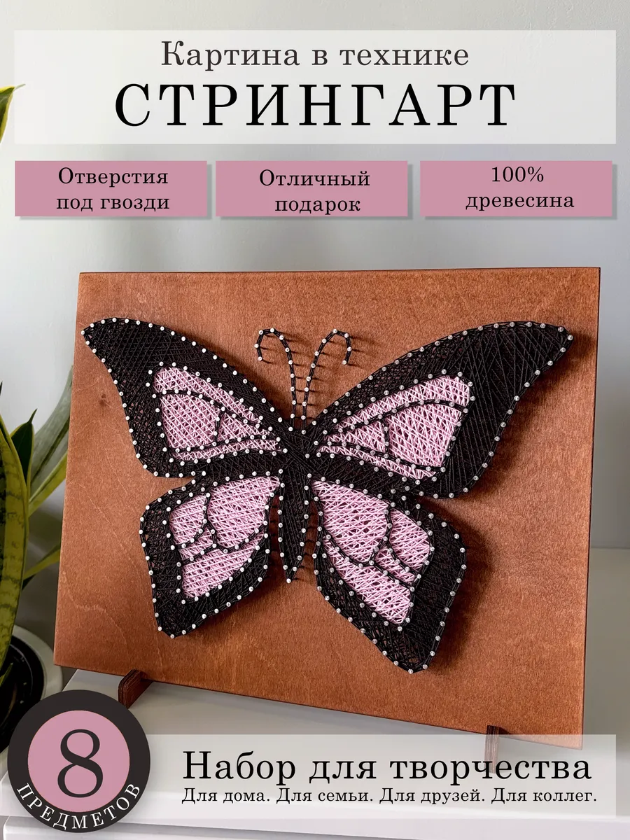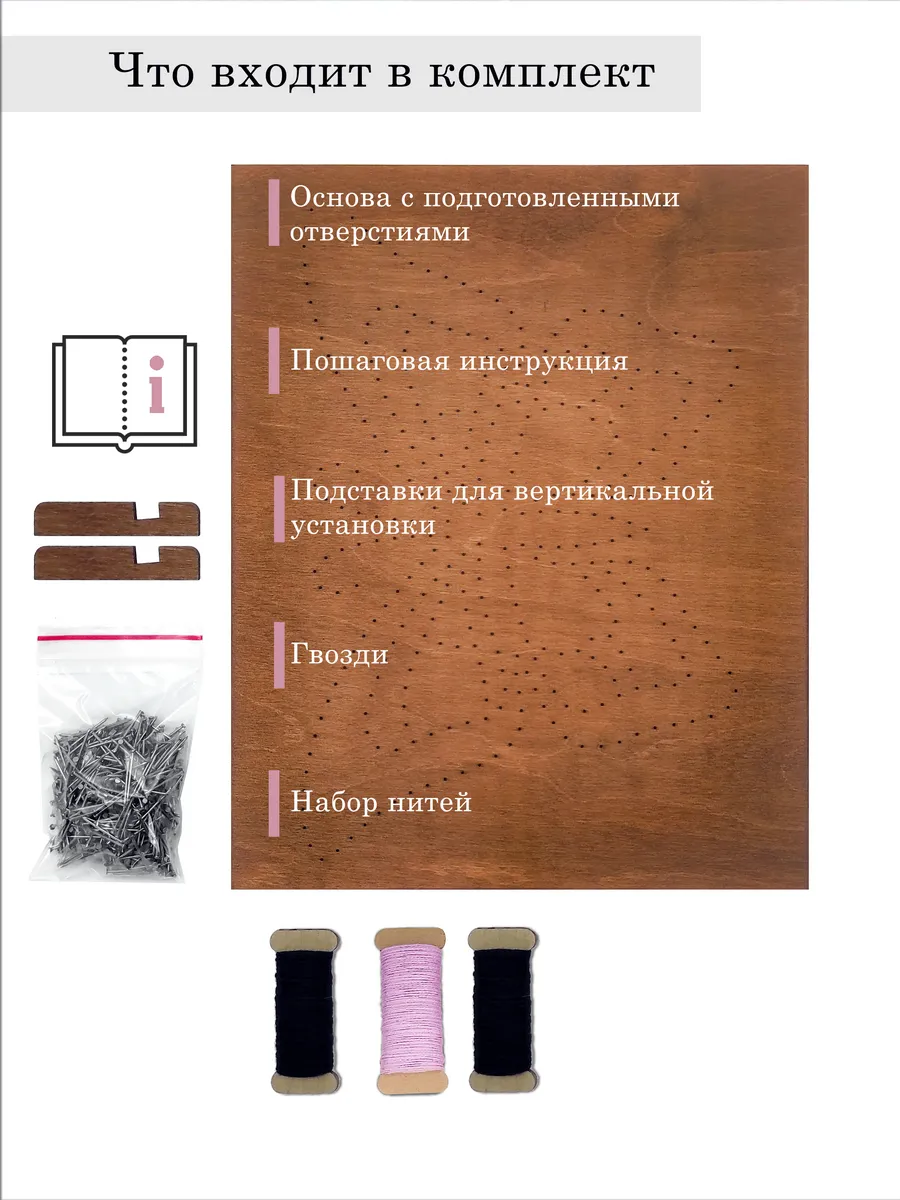 В наборе вы найдете все необходимые материалы для ручного творчества: нитки, гвозди и инструкцию, которая поможет вам шаг за шагом создать картину. Разнообразные цветовые комбинации вдохновят вас на создание неповторимых изделий, которые привнесут уют в ваш интерьер. Это отличный способ самовыражения — вы сможете построить свою картину так, как вам хочется, добавляя индивидуальный штрих.