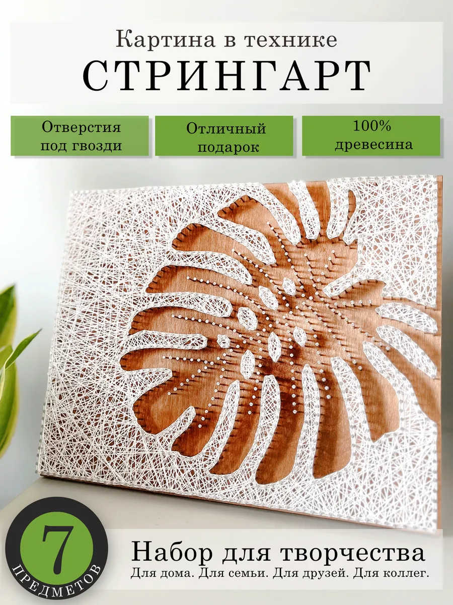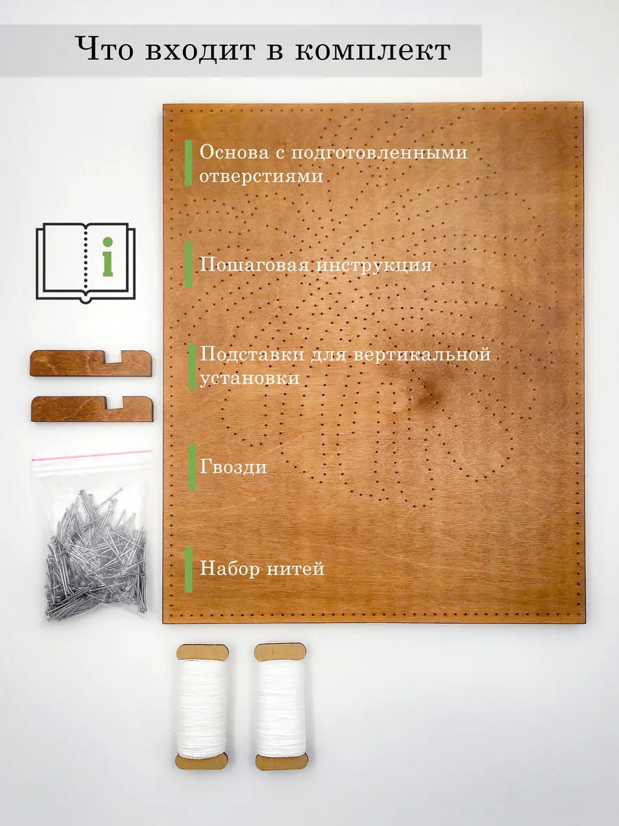 Картина из ниток и гвоздей идеально подходит для подарка на день рождения другу, девушке или маме. Это не просто презент, это возможность создать что-то красивое своими руками и провести время в творческой атмосфере. Набор включает в себя все, что нужно для начала: цветную деревянную основу с намеченными отверстиями, подставки, нитки, гвозди и подробную инструкцию, что делает процесс простым и доступным.