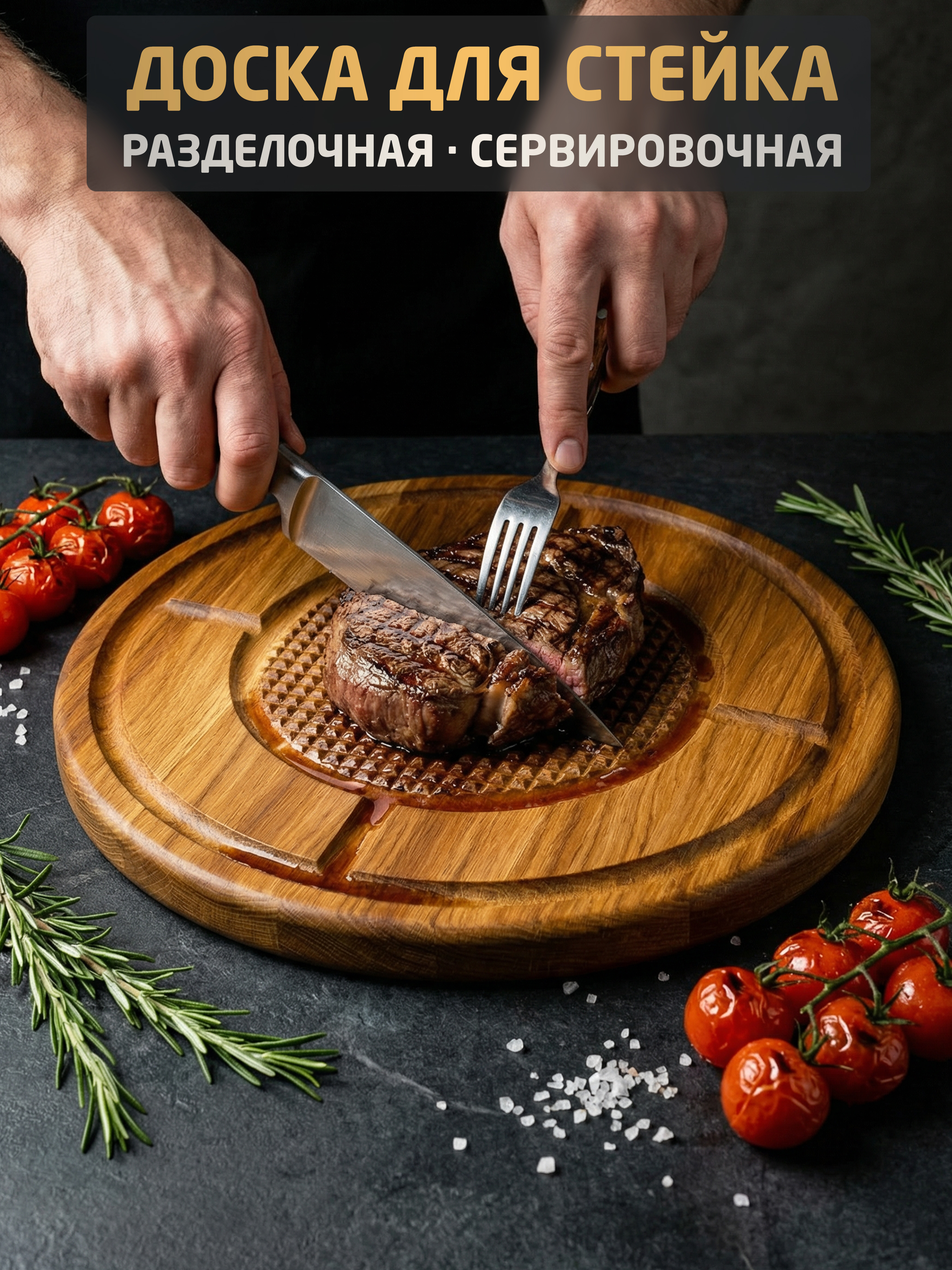 Стейк остаётся на месте, а сок — внутри доски.