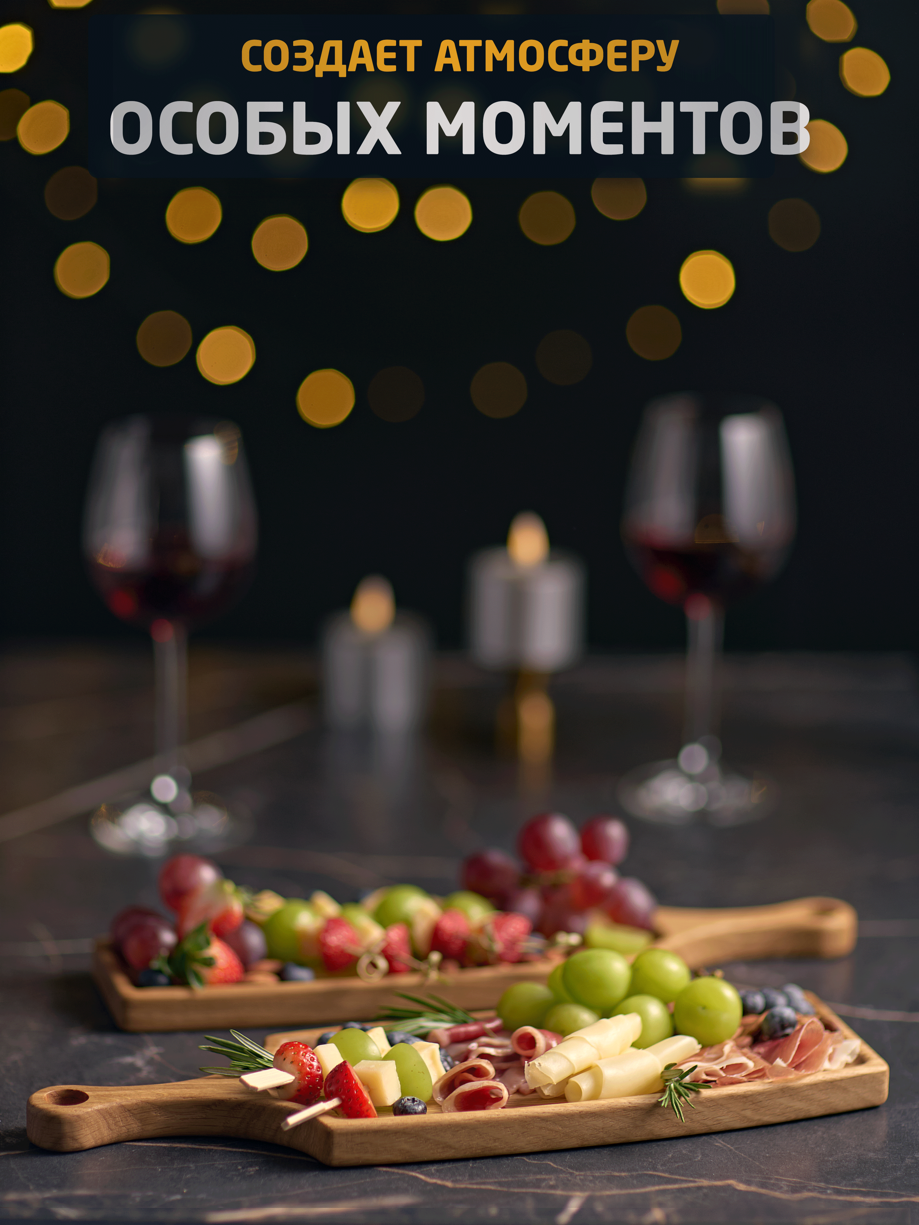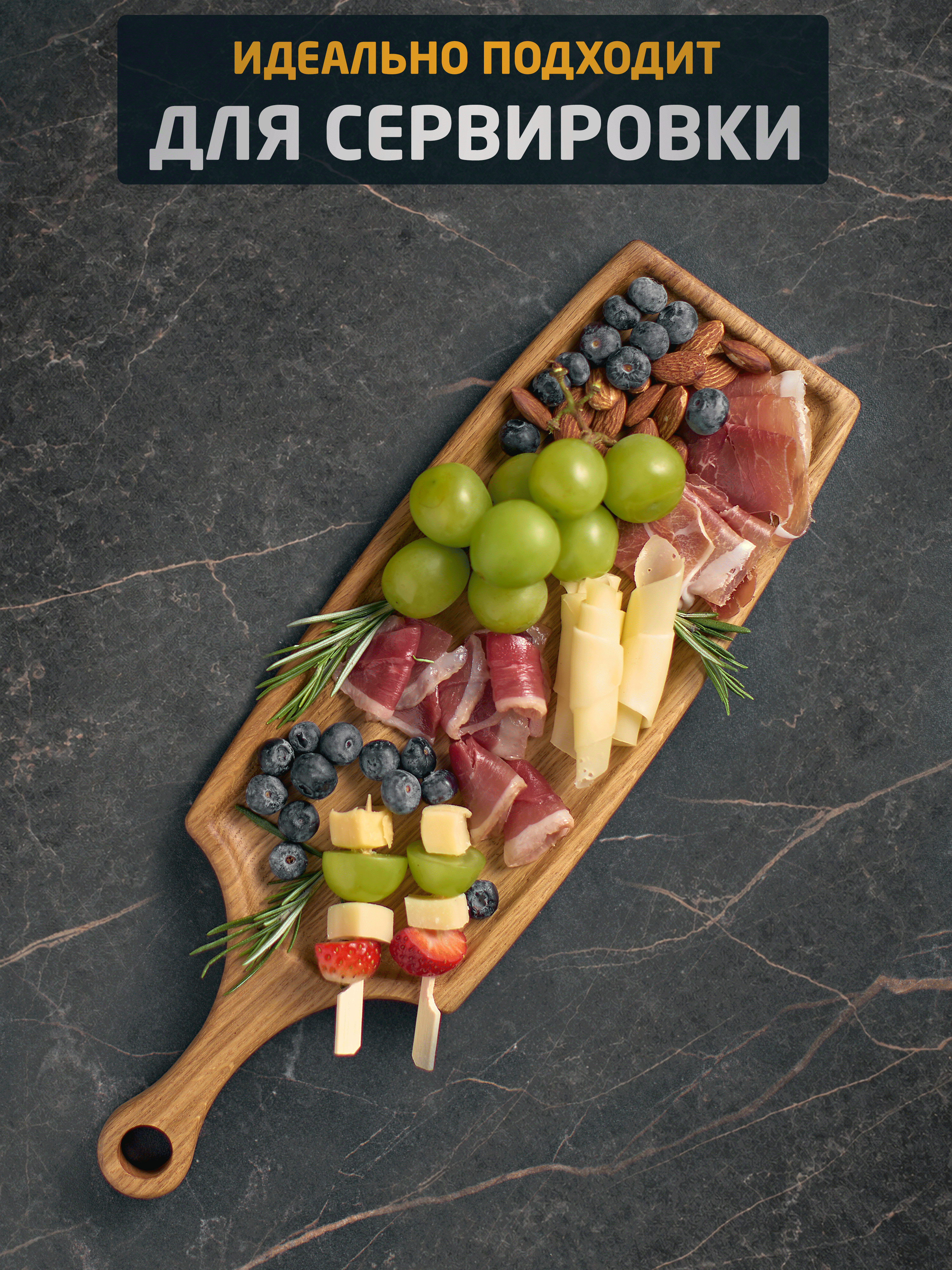 Продуманная форма делает доску удобной для подачи порционных закусок и сетов, а также позволяет красиво разместить её даже на небольшом столе.