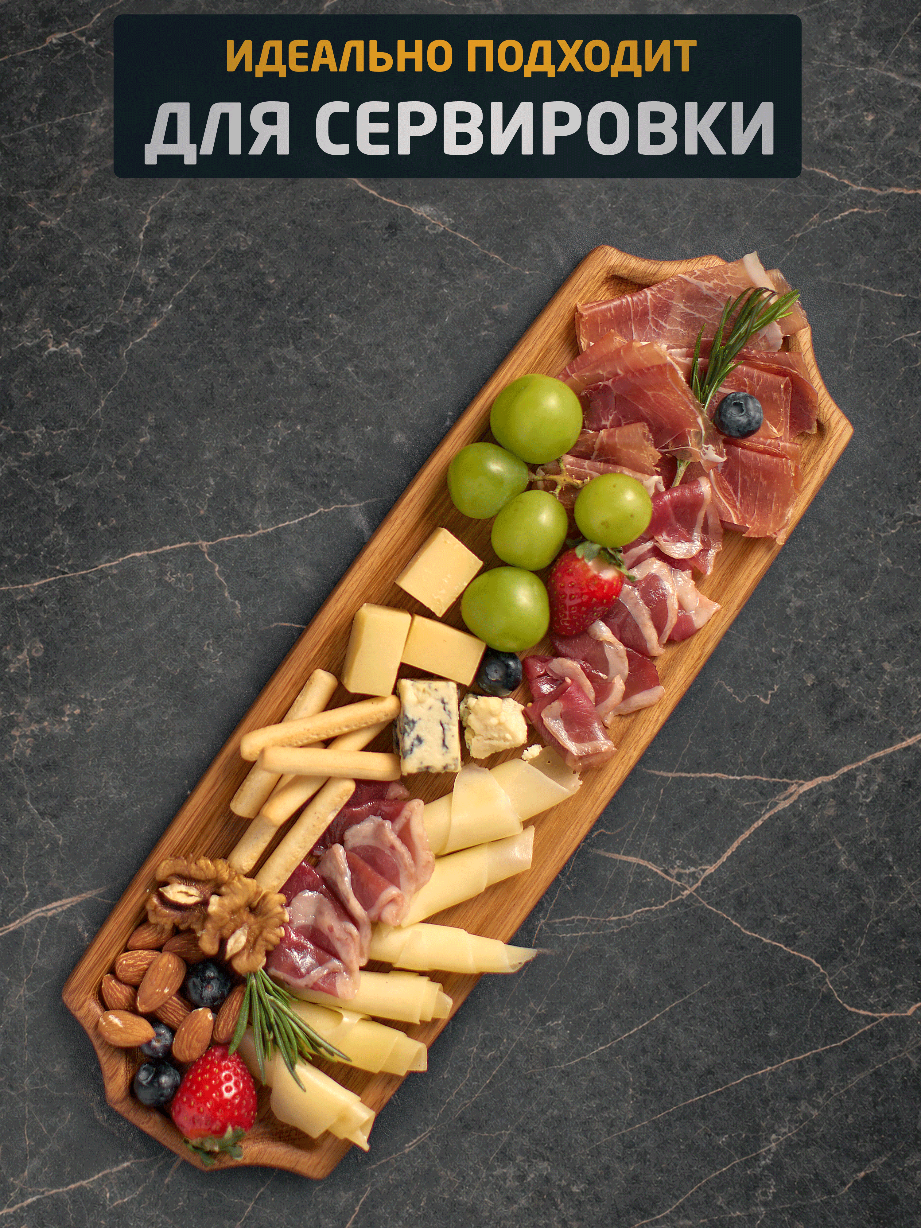 Продуманная форма делает доску удобной для подачи порционных закусок и сетов, а также позволяет красиво разместить её даже на небольшом столе.